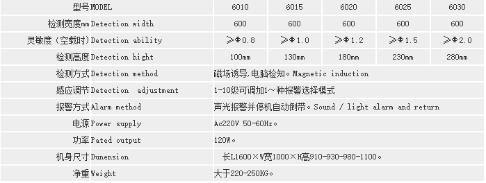 说明:灵敏度的高低由检测高度(即通道或龙门)来决定最高检测精度。龙门越高,灵敏度就相应降低。以上对应的高度和检测标准是在空机状态下的检测结果;检测通道高度和宽度,都可以按要求定做!