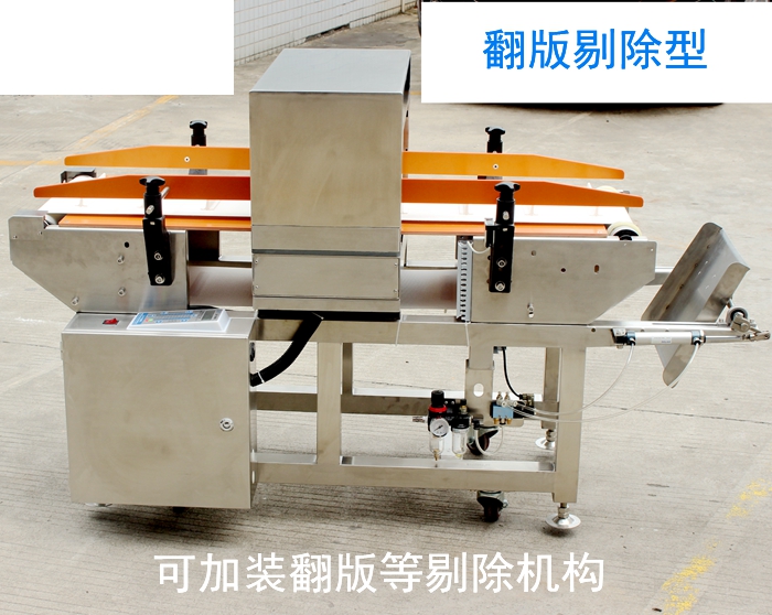 报警方式:检测到金属异物自动停机倒带,并蜂鸣器报警,可选装翻板、吹气、推杆、升降排除等剔除机构!