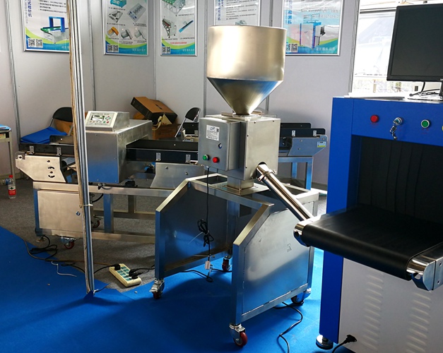 原料从料斗或送料器自由下落进入金属分离器,如果没有金属杂质,原料会直接通过金属分离器流向下端的出料口。如果检测器检测到原料中含有金属,那么控制器立刻启动分离板将金属物和部分原料一起导向侧面的排料口,然后分流板迅速恢复至正常的位置,分流板速度可调,金属分离器的检测精度也可根据生产需要调节,最小可检测并分离出Φ 0.2mm的金属颗粒。
