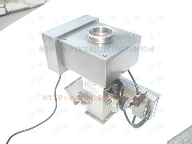 原料从料斗或送料器自由下落进入金属分离器,如果没有金属杂质,原料会直接通过金属分离器流向下端的出料口。如果检测器检测到原料中含有金属,那么控制器立刻启动分离板将金属物和部分原料一起导向侧面的排料口,然后分流板迅速恢复至正常的位置,分流板速度可调,金属分离器的检测精度也可根据生产需要调节,最小可检测并分离出Φ 0.2mm的金属颗粒。