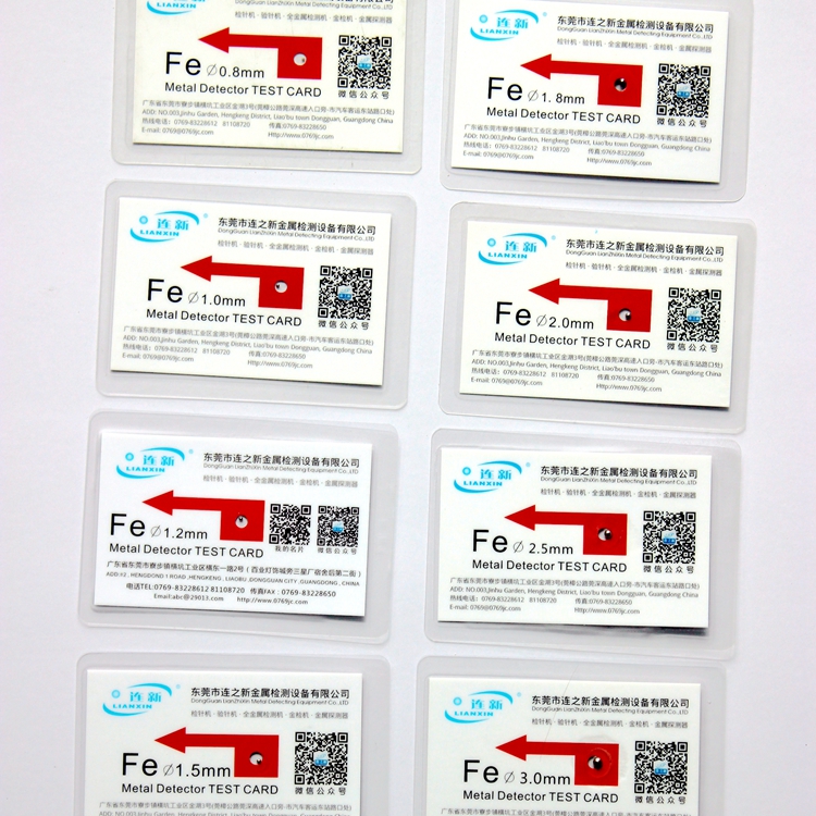 金属检测机测试用铁FE测试卡片,主要用于检测金属检测机,也就是检针机和金检机食品金探机。通常金属检测机分为磁感应式金属检测机和全金属检测机。顾名思义,磁感应式金属检测机只能检测可被磁铁吸附的金属,如铁、钴、镍以及含有一定量的磁性金属元素的合金。金属检测机的检测能力,就要用这些装载了一定规格大小的金属球来测试衡量,能检测到越小的金属测试卡,说明机器性能越可靠!