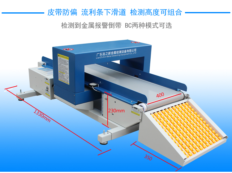 这是一款400型输送带式检针机,可直接放置在流水线上使用进行检针验针作业,不需要改造流水线就可以加装检针机,也不需要占用通道摆放检针机,节省使用空间节省检针时间和效率。