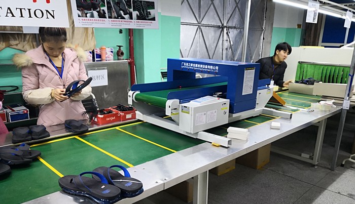 莆田鞋厂流水线上检针机使用现场: